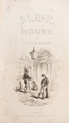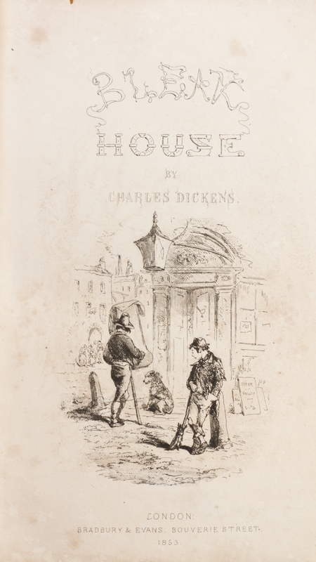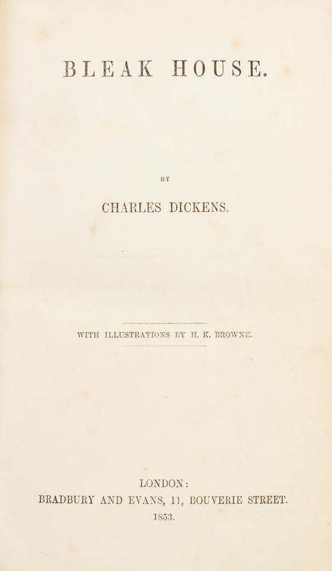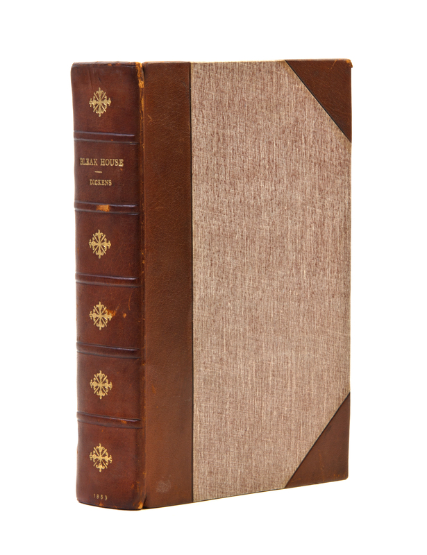 Bleak House. London: Bradbury and Evans, 1853.8vo, rebound in 3/4 calf over brown cloth, gilt-lettered spine. First edition in book form, bound from the original parts. With frontispiece, additional engraved title, and 40 engraved plates by Hablot K. Browne ("Phiz"). Light wear to boards; scattered light brownspotting.