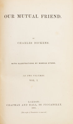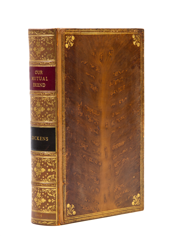 Our Mutual Friend. London: Chapman and Hall, 1865.2 vols. in one. 8vo, rebound in full tree calf, gilt-tooled and -lettered spine, red leather spine label, a.e.g. First edition in book form, bound from the original parts with original front wrapper of part 5, and 34 pp. publisher's advertisements bound-in at rear. Scattered brownspotting.