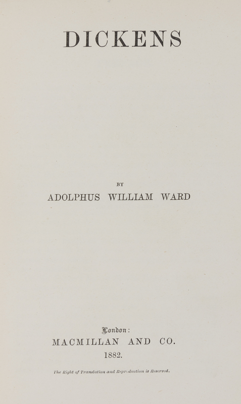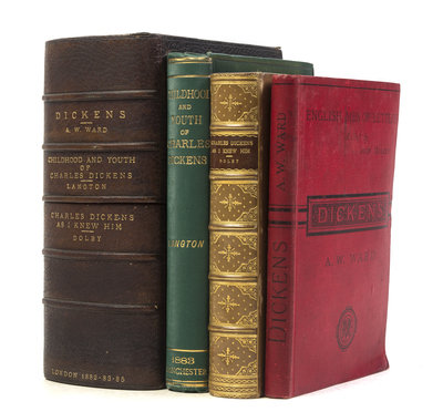 A group of three bibliographical reference works pertaining to Charles Dickens, housed in a green crushed morocco slipcase.Charles Dickens as I Knew Him. The Story of the Reading Tours in Great Britain and America, (1866-1870). By George Dolby. London: T. Fisher Unwin, 1885. 8vo, bound by Riviere in 3/4 calf over marbled boards, gilt-tooled and -lettered spine, t.e.g. Minor rubbing to boards. Dickens. By Adolphus William Ward. London: Macmillan, 1882. 8vo, red cloth. Wear to boards; hinges starting. The Childhood and Youth of Charles Dickens. By Robert Langton. Manchester: By the Author, 1883. 8vo, gilt-lettered green cloth. Ends bumped; hinges starting.
