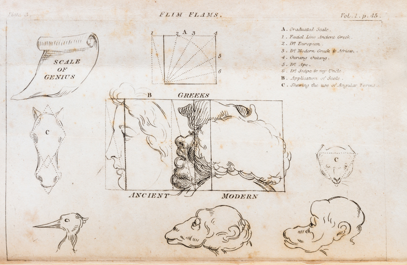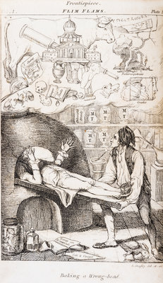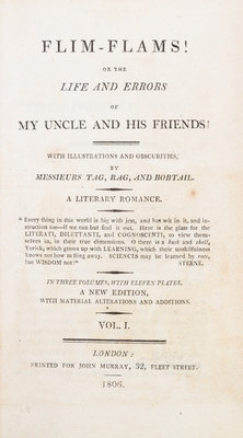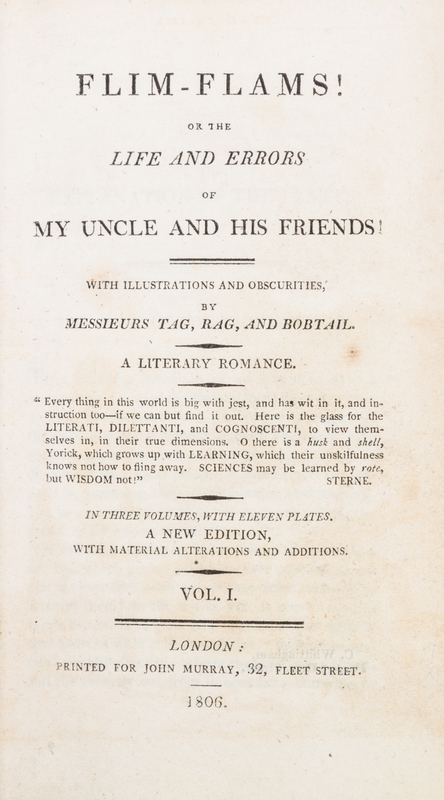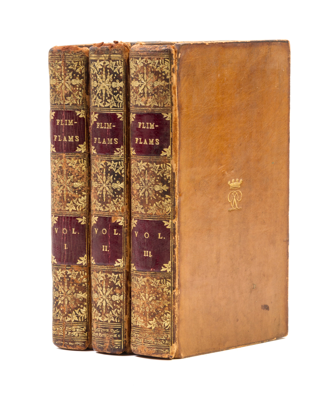 Flim-Flams! Or the Life and Errors of My Uncle and His Friends! With Illustrations and Obscurities, by Messieurs Tag, Rag, and Bobtail. London: John Murray, 1806.3 vols. 8vo, contemporary calf gilt-stamped with the initials "DR" surmounted by a crown to both boards, gilt-tooled and -lettered spines. Second edition, with 11 engraved plates. Edgewear and ends chipped; hinges starting; scattered light brownspotting.