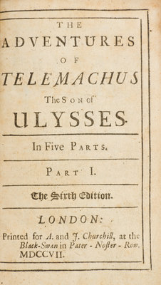 The Adventures of Telemachus, the Son of Ulysses. London: A. and J. Churchill, 1707.5 parts in one. Small 8vo, rebound in full calf. Sixth edition. Wear to boards; renewed endpapers; foxing throughout.
