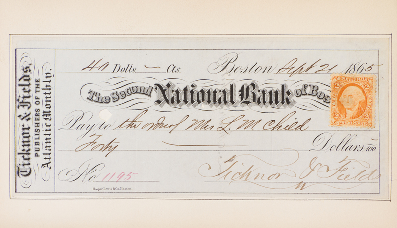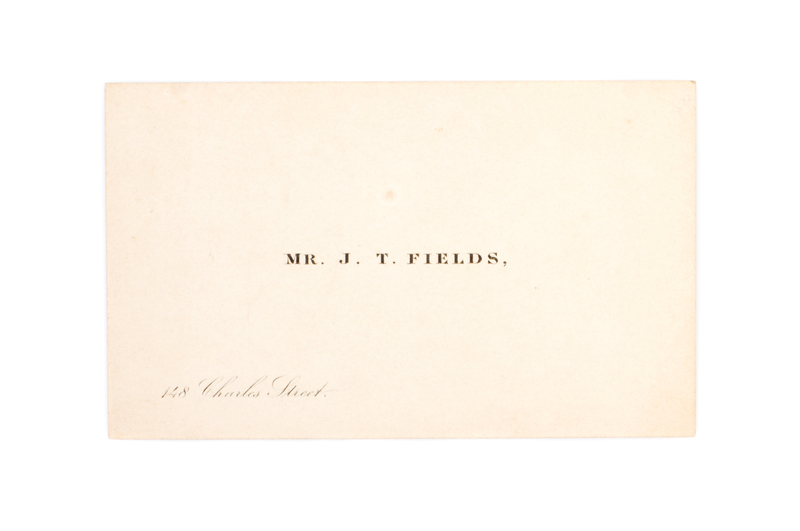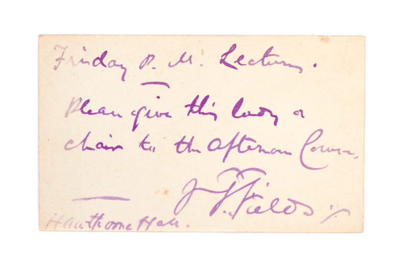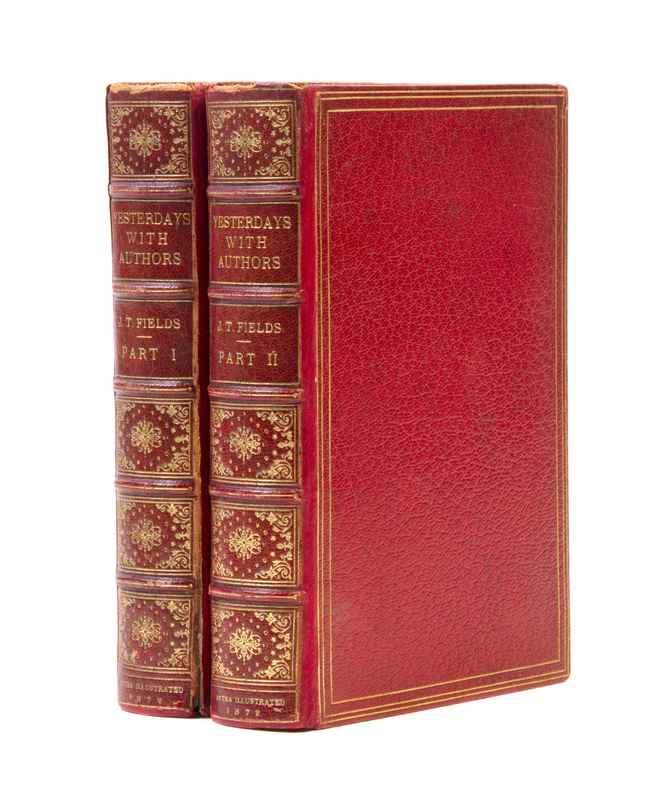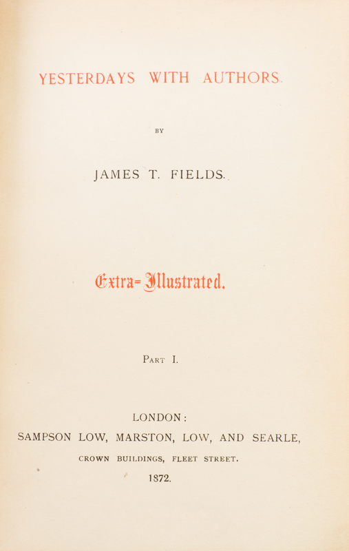 Yesterdays With Authors. London: Sampson, Low, Marston, Low and Searle, 1872.2 vols. 8vo, bound by Sangorski and Sutcliffe in full red morocco, gilt-lettered and -tooled spines, marbled endpapers, t.e.g., portrait frontispiece, extra-illustrated with 102 plates. Autograph letter signed ("James T. Fields"), 5pp., Boston, December 6, 1853, to Miss Mitford, tipped in Part 1; two original royalty checks from Ticknor and Fields, signed on the verso by contributing authors, Lydia Maria Child (Part I) and Alice Cary (Part 2), tipped into page mount, and an Mr. J.T. Fields calling card, autographed on the verso, with a note admitting a lady to an event, Hawthorne Hall, laid into Part I. Some light chipping to heads of spine.