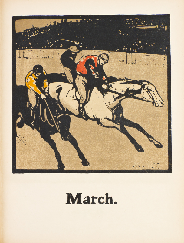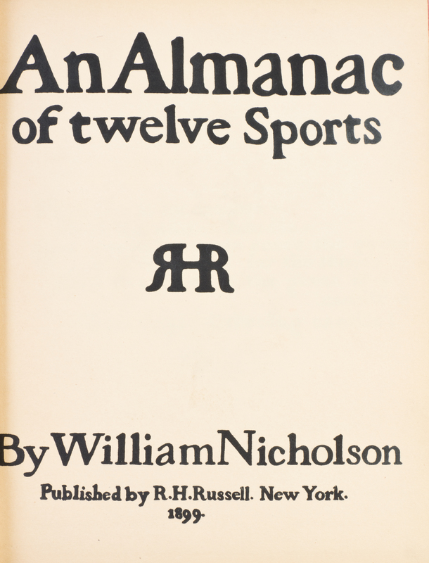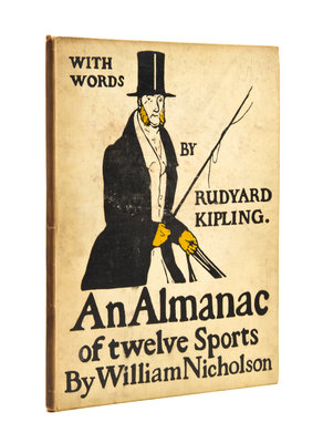 An Almanac of Twelve Sports. With Words by Rudyard Kipling. New York: R.H. Russell, 1899.Folio, original cloth pictorial boards. Third impression, with two leaves containing a complete calendar for 1898, followed by 12 full-page illustrations by Nicholson for each month, with text by Kipling. Light wear and soiling to boards; minor offsetting from illustrations.