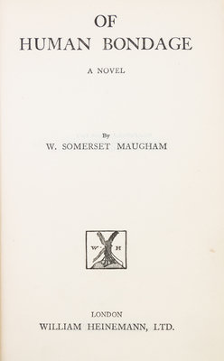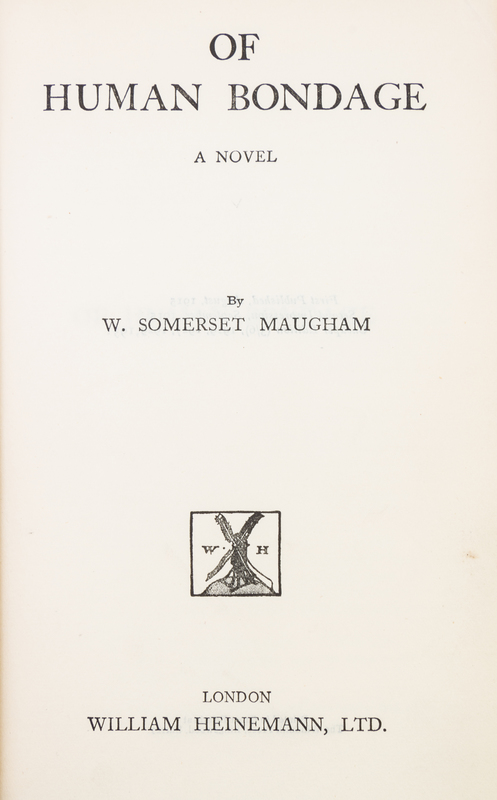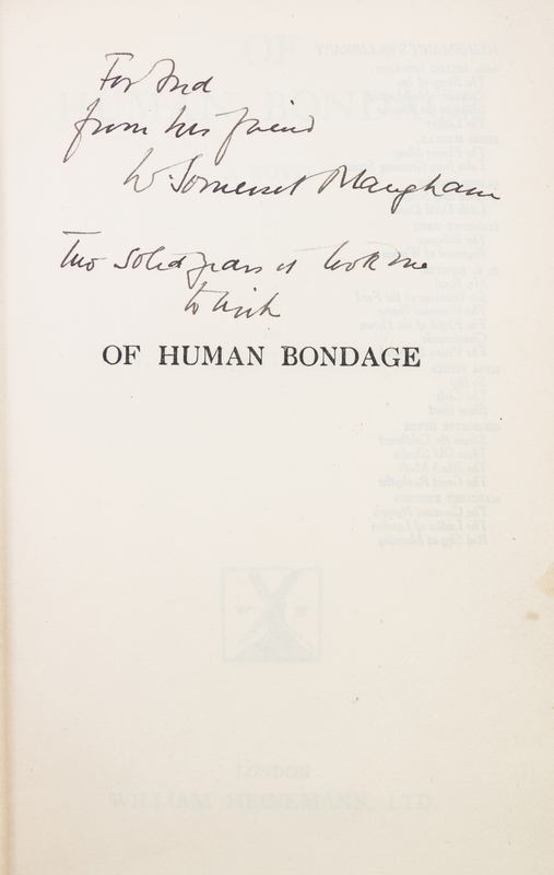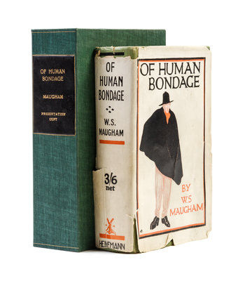 Of Human Bondage. London: William Heinemann, 1931.8vo, publisher's green cloth lettered in black, pictorial dust jacket, housed in green cloth clamshell case. 3/6 Library edition, third impression. Inscribed and signed by Maugham on half-title. Rare dust jacket with the same illustration used on the suppressed British first edition, featuring the novel's main character, Philip Carey. The dust jacket was replaced on the first edition because the artist had drawn the character's club foot on the wrong leg. Thus, this illustration is scarce. Ends bumped; jacket lightly soiled and torn with loss to spine and edges; hinges starting.