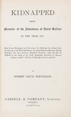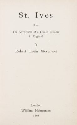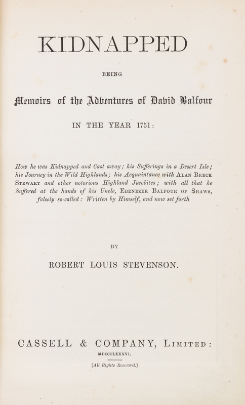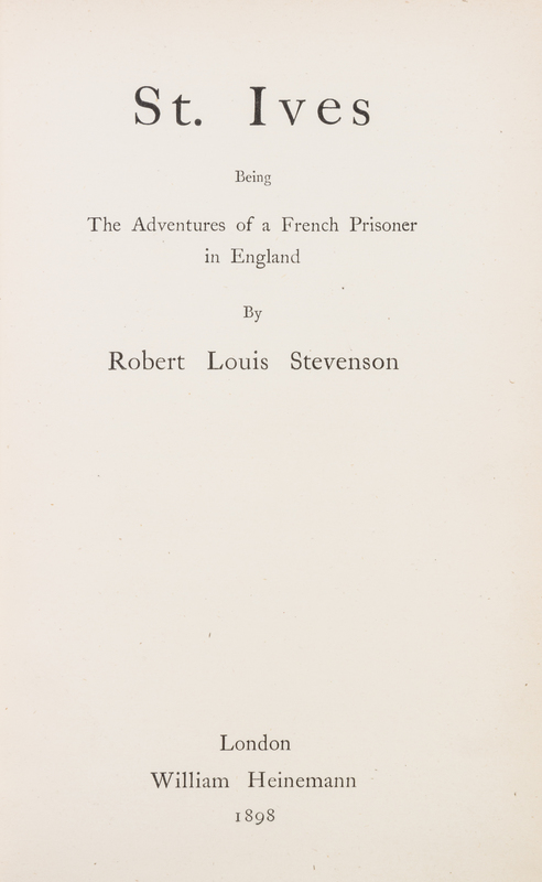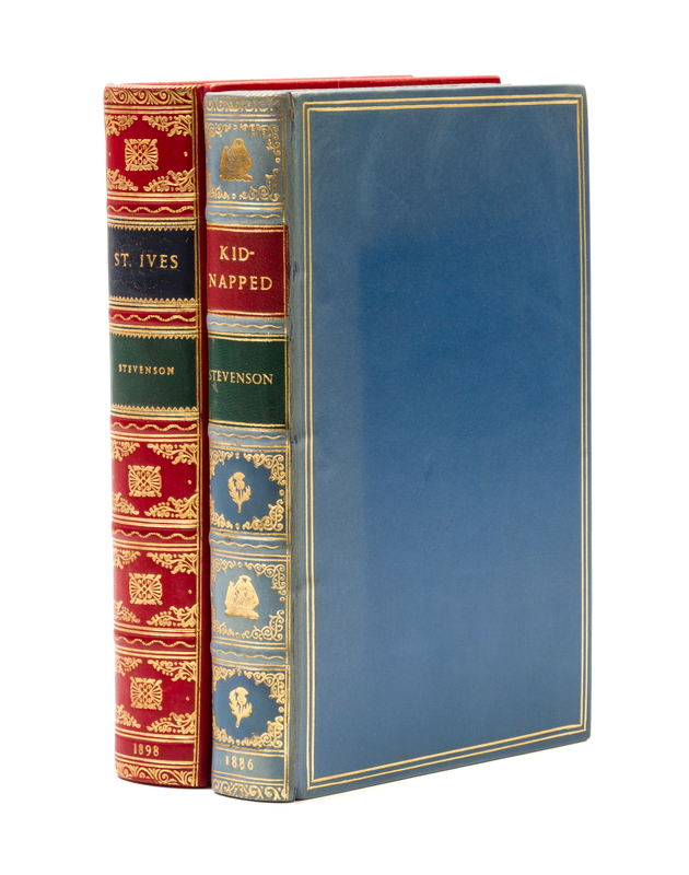 St. Ives: Being The Adventures of a French Prisoner in England. London: William Heinemann, 1898. 8vo, bound by Bayntun in full red calf gilt-decorated and -lettered spine, gilt-inner dentelles, a.e.g., red cloth slipcase. First edition. Fine.[Together with:] Kidnapped, Being Memoirs of the Adventures of David Balfour in the Year 1751. London: Cassell, 1886. 8vo, bound by Bayntun in full blue calf, gilt-decorated and -lettered spine, gilt-inner dentelles, a.e.g. First edition, with folding map frontispiece. Light fading to boards.