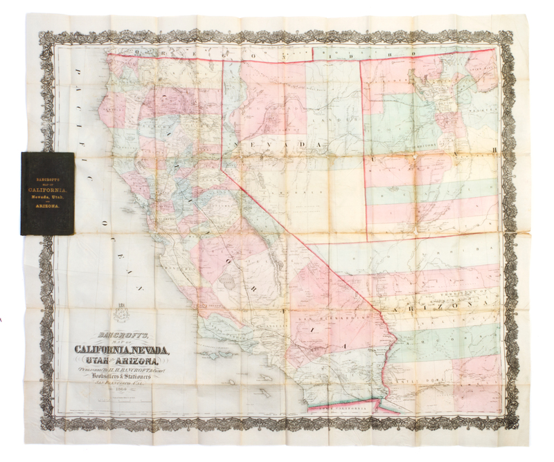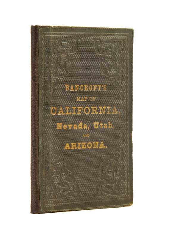 Bancroft's Map of California, Nevada, Utah and Arizona. San Francisco: H.H. Bancroft, 1864.8vo, original gilt and blind-stamped cloth, rebacked. Hand-colored fold-out lithographed pocket map. Light toning to creases and edges; very minor marginal chipping; otherwise fine.