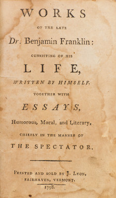 Works of the Late Dr. Benjamin Franklin: Consisting of His Life, Written by Himself. Together with Essays, Humorous, Moral, and Literary, Chiefly in the Manner of the Spectator. Fairhaven, VT: J. Lyon, 1798. Small 8vo, full calf, gilt-lettered leather spine label. Rubbing to boards; intermittent brownspotting; light dampstaining affecting most leaves; manuscript ex-libri to preliminary blanks.