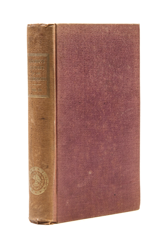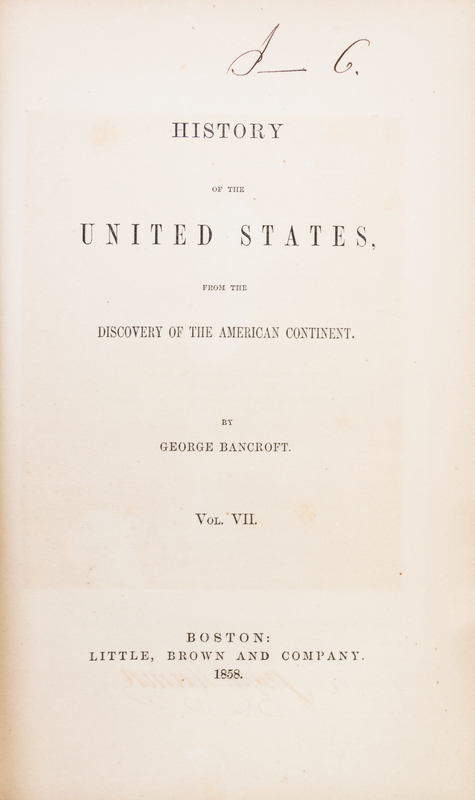 History of the United States, from the Discovery of the American Continent. Boston: Little, Brown and Company, 1858.Vol. 7 (of 12) only. 8vo, publisher's brown cloth, gilt-lettered spine. Signed "Millard Fillmore" on the front pastedown and additionally inscribed "May 12, 1869 - finished reading this volume -- M.F." in pencil on page 435. Stamped "E.J. Fillmore" to front pastedown and title page. Boards faded; ends bumped; scattered light foxing.
