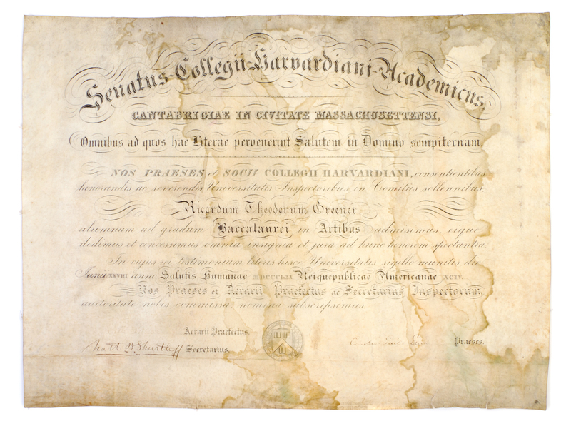 Partially printed document, one page, on vellum, being the original Bachelor of Arts diploma for Richard Theodore Greener from Harvard College, June 28, 1870.Richard Greener (1844-1922) was the first African-American graduate of Harvard College. After studying at Oberlin and Andover, Greener enrolled in Harvard in 1865, where he won two Bowdoin Prizes as an undergraduate. Following his graduation with honors, Greener taught philosophy at the University of South Carolina, from which he was able to obtain his law degree in 1876. He was admitted to the South Carolina bar in 1878 and later became the dean of the department of law at Howard University. Greener was appointed secretary of the Grant Memorial Association in New York in 1885 and, later, U.S. commercial agent at Vladivostok in Siberia by President McKinley in 1898. He retired from office and foreign service in 1905 and lived with cousins in Chicago until his death in 1922. Greener's daughter, called Belle da Costa Greene, was an expert in medieval manuscripts who worked directly with J.P. Morgan at the Morgan Library in New York and is said to have been the mistress of the art historian and critic, Bernard Berenson.Richard Greener's personal papers, previously thought to have been lost during the San Francisco earthquake of 1906, were recovered in recent years by the present owner from a home in Chicago. A portion of the documents were sold to the University of South Carolina.The first African-American graduate of Harvard College, the first African-American faculty member at University of South Carolina, and an intellectual luminary in Reconstruction-period America, Greener was a pioneer of social and racial equality in the racially divided South. His Harvard diploma, a document of incalculable historical significance, has never before been offered at public auction.