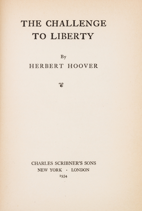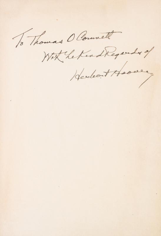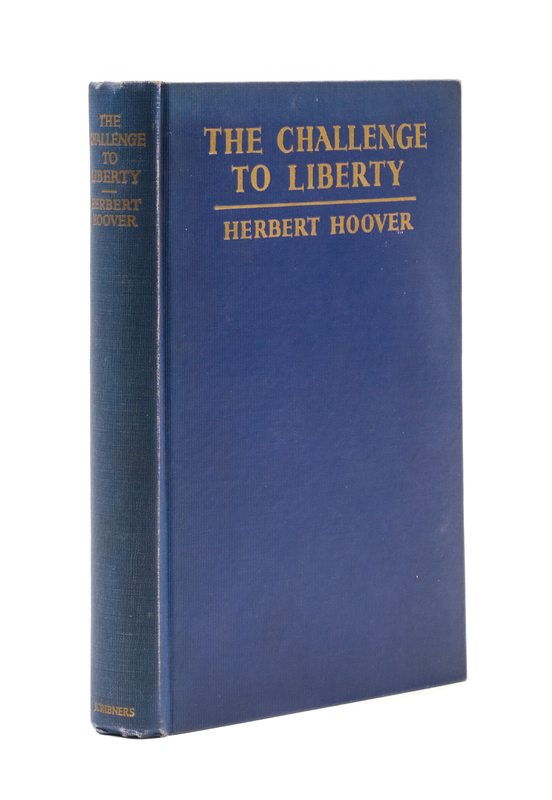 The Challenge to Liberty. New York and London: Charles Scribner's Sons, 1934.8vo, gilt-lettered blue cloth. First edition. Signed and inscribed "To Thomas O'Connell, with the kind regards of Herbert Hoover." Light soiling to boards; spine faded and ends bumped.