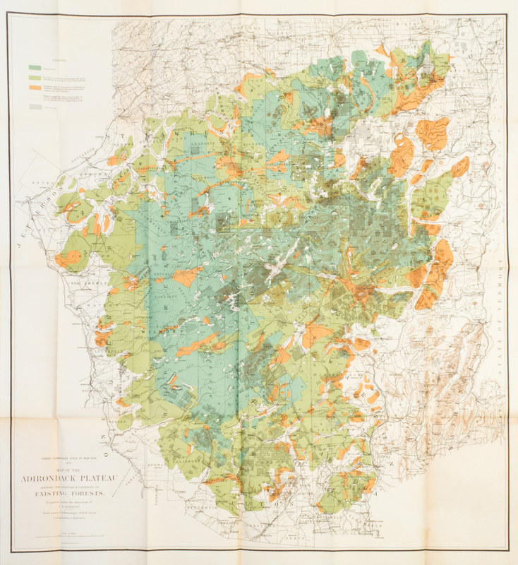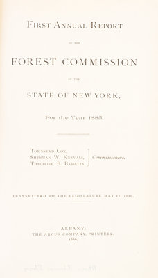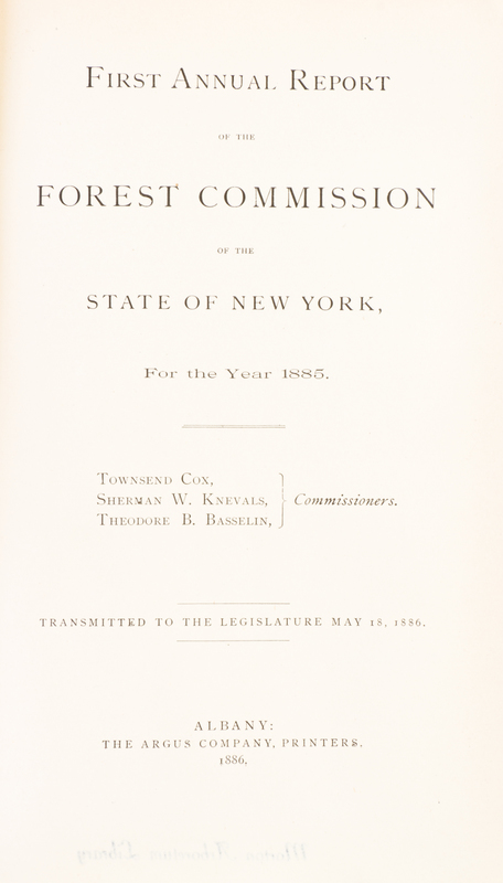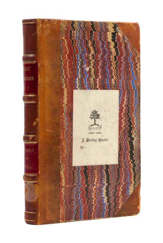 First Annual Report of the Forest Commission of the State of New York, for the Year 1885. Albany: Argus, 1886.8vo, 3/4 tan morocco over marbled boards, gilt-lettered red morocco spine label. J. Sterling Morton copy with his bookplate pasted to front board and rear pastedown and inscribed by him on the f.f.e.p., signed ("J. Sterling Morton"), Arbor Lodge, Otoe County, Nebraska. With fold-out map of the Adirondack Plateau in pocket at front. Ex-Morton Arboretum Library copy with checkout card and pocket tipped to front endpaper; light wear and soiling to boards.