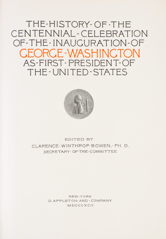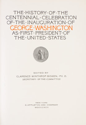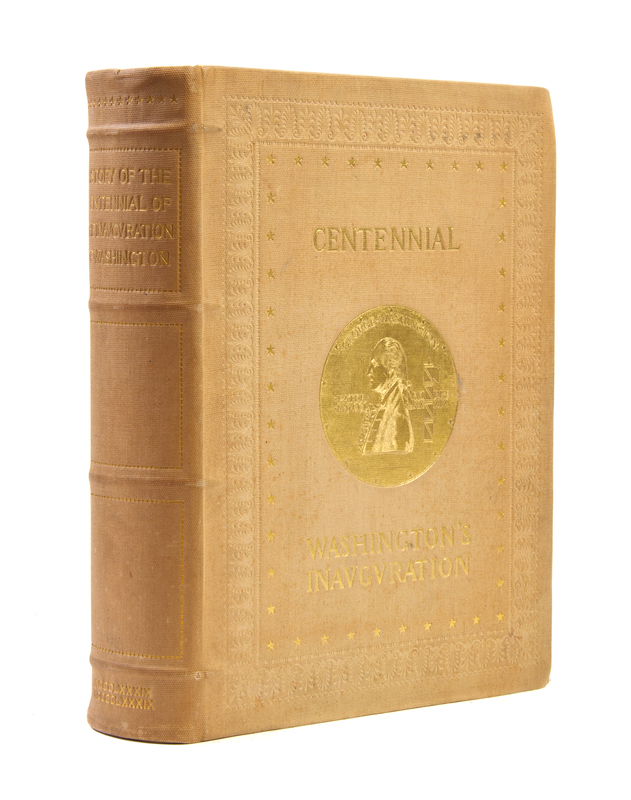 The History of the Centennial Celebration of the Inauguration of George Washington as First President of the United States. New York: D. Appleton, 1892. Thick 4to, publisher's gilt-pictorial cream cloth, a.e.g., engraved frontispiece. One of 1,000 numbered copies. Some soiling to cloth with ends bumped; hinges starting, tape along inner hinge and some separation at endpaper.
