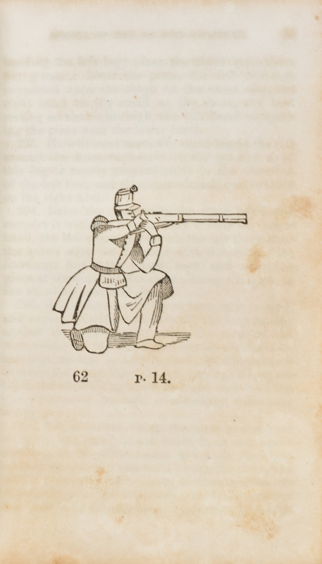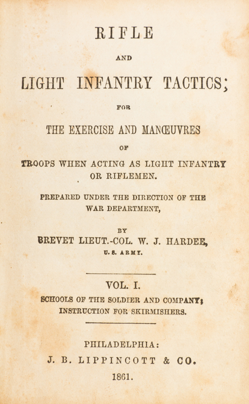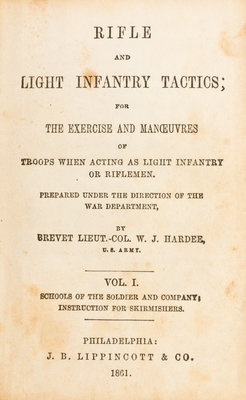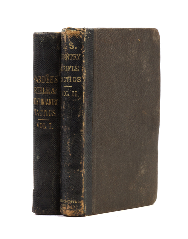 Rifle and Light Infantry Tactics; for the Exercise and Manoeuvres of Troops when Acting as Light Infantry or Riflemen. Philadelphia: J.B. Lippincott, 1861.2 vols. 32mo, black cloth, gilt-lettered spines. With 67 plates (15 fold-out). Fading and rubbing to boards; light scattered foxing.