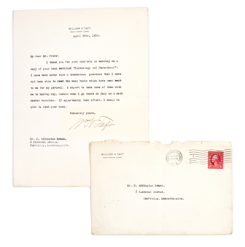 Typed letter signed ("Wm. H. Taft"), one page, on personal letterhead, New Haven, Connecticut, April 25, 1915, to author H. Addington Bruce, thanking him for sending him a copy of his book and explaining that he has not had a chance to read it. Together with original mailing envelope.