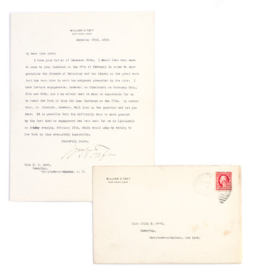 Typed letter signed ("Wm. H. Taft"), one page, on personal letterhead, New Haven, Connecticut, December 22, 1914. Taft responds to Edith R. Batt, graduate of Wellesley College, congratulating her and the friends of Wellesley and her alumni on the work done to rebuild the campus after a fire on March 17, 1914, and apologizing for being unable to attend a luncheon in their honor. Together with original mailing envelope.
