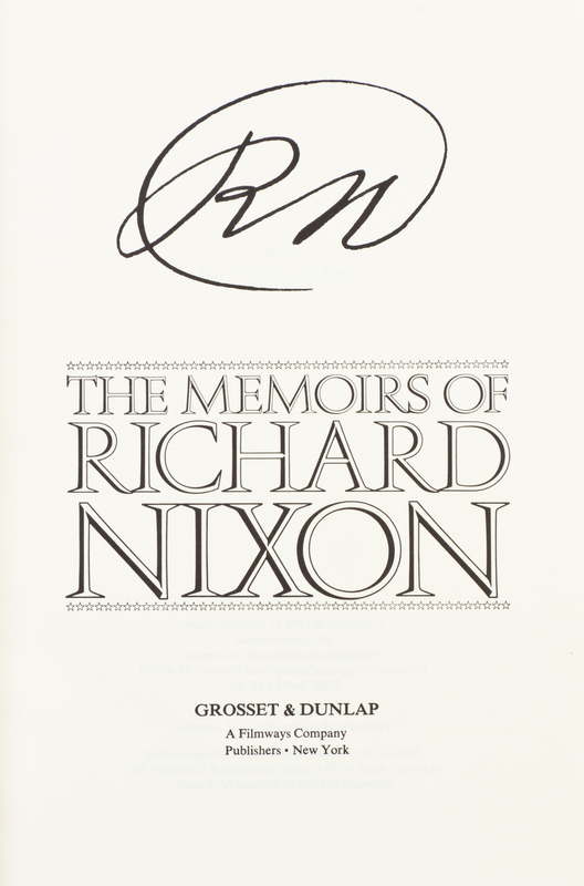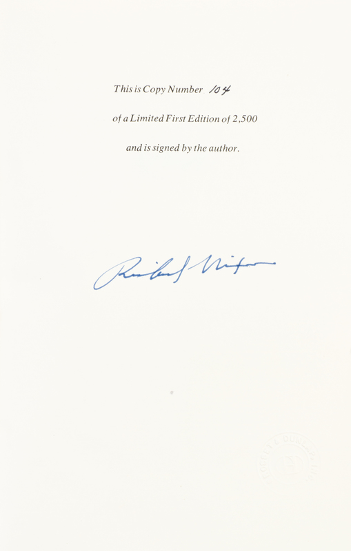 The Memoirs of Richard Nixon. New York: Grosset & Dunlap, (1978).Thick 8vo, publisher's blue gilt-stamped leatherette. Limited edition, number 104 of 2,400 copies. Signed by Nixon on an inserted page. Fine.