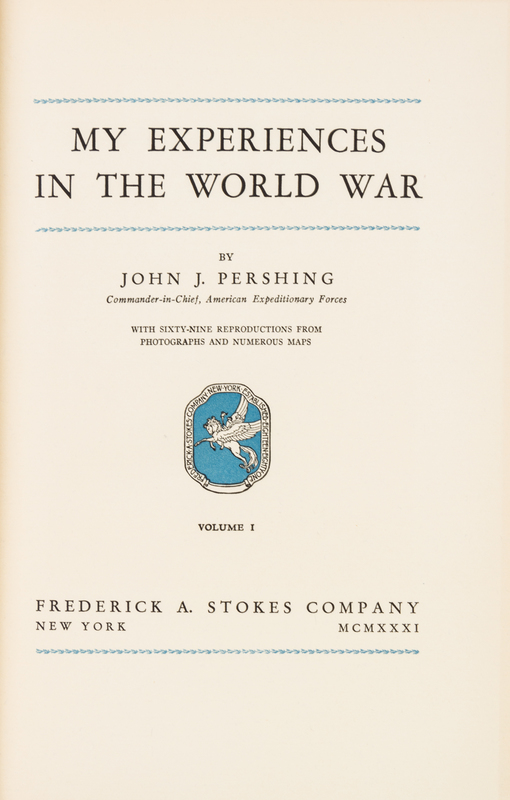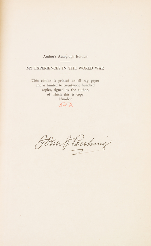 My Experiences in the World War. New York: Frederick A. Stokes, 1931.2 vols. 8vo, publisher's olive cloth lettered in black on gilt labels to upper boards. Author's Autograph Edition, number 552 of 2,100 copies signed by Pershing on the limitation page. Lacking dust jackets; minor edgewear.