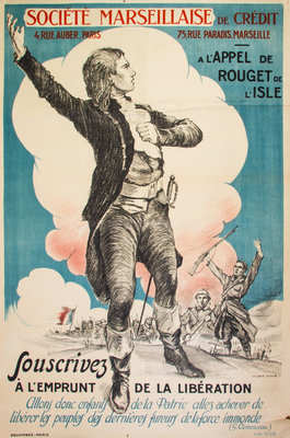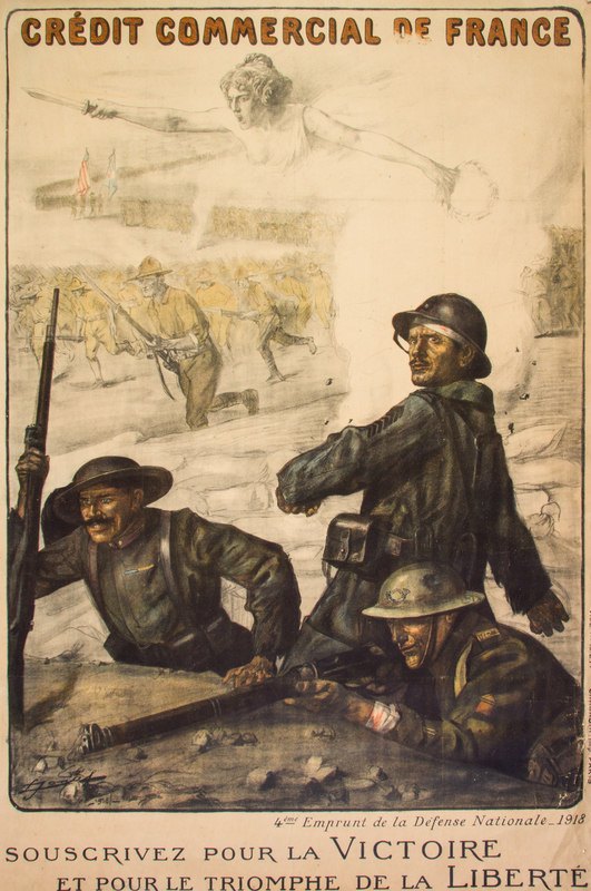 Four French WWI propaganda posters, including Chemins de fer de l'Etat by Maurice Toussaint; Souscrivez a l'empunt national by George Scott; Societe Marseille de credit by Jaques Carlu; and Credit commercial de France by Fonof. Scott poster in pieces.