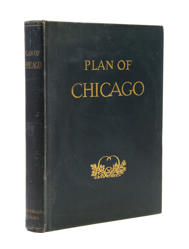 Plan of Chicago. Chicago: The Commercial Club, 1909.4to, publisher's blue cloth lettered in gilt, frontispiece, t.e.g. Illustrated with numerous color plates, some fold-out. Limited edition, number 393 of 1,650 copies. Presentation copy, presented to Judge Albert C. Barnes by the Commercial Club with its bookplate tipped to the front pastedown. Boards rubbed and faded; ends bumped; toning to edges of leaves.