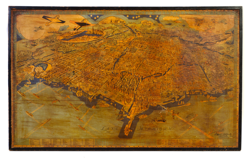 An Illustrated Map of Chicago. Chicago: Houghton Mifflin, 1931. Bird's eye view, pictorial map of Chicago, pasted to board. Showing events and landmarks during the World's Fair of 1933 including major rivers and other bodies of water, streets, railroads, parks, planes, ships and boats. A table on lower margin, lists the points of interest in Chicago. Framed.