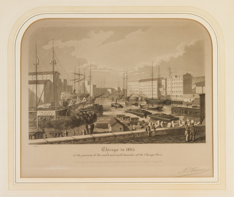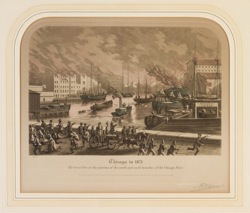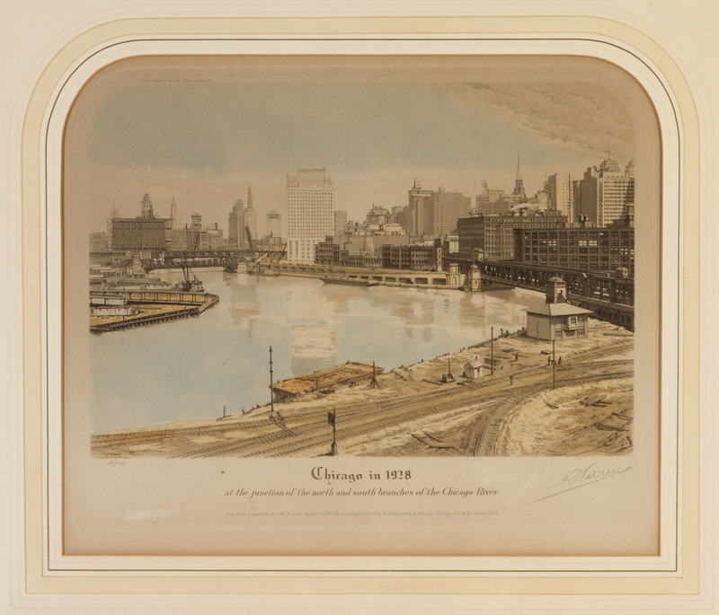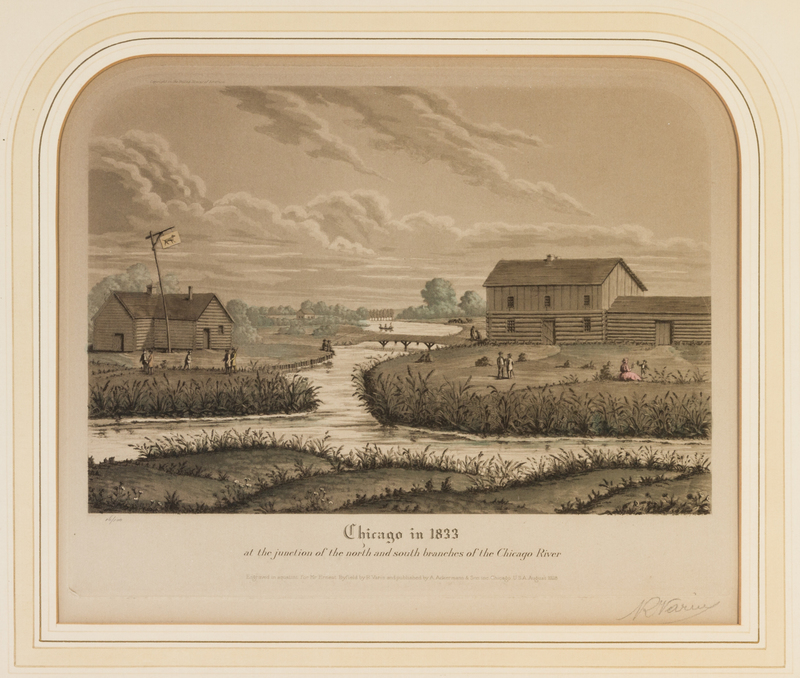 A group of four original color aquatints (Chicago: A. Ackermann and Son, 1929-1930), comprising Chicago in 1833, at the Junction of the North and South Branches of the Chicago River no. 16/100; Chicago in 1865, at the Junction of the North and South Branches of the Chicago River, no. 16/100; Chicago in 1871, The Great Fire, at the Junction of the North and South Branches of the Chicago River, no. 16/100; and Chicago in 1928, at the Junction of the North and South Branches of the Chicago River, no. 16/100. Each signed "R. Varin" in pencil, bottom right corner. Framed and matted.