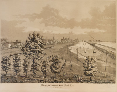 Michigan Avenue from Park Row, in the Year 1865. Trial Proof Copy. Chicago: A. Ackerman, n.d. [c. 1926] Original aquatint print. Trial Proof Copy, signed in pencil ("R. Varin") to lower right. Framed and matted.