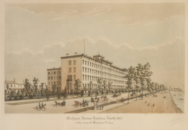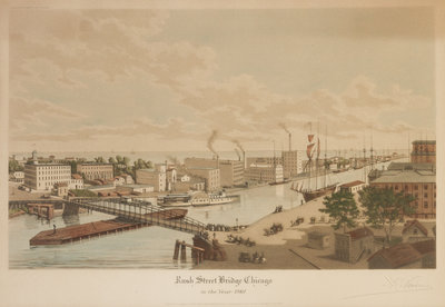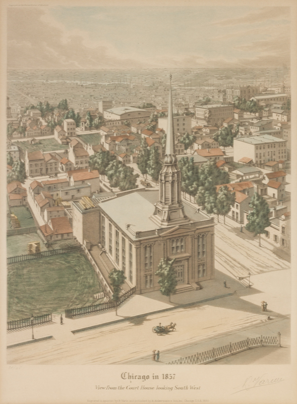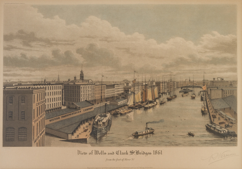 A group of four original color aquatints (Chicago: A. Ackermann and Son, 1929-1930), comprising Rush Street Bridge Chicago in the Year 1861, no. 34/125; Chicago in 1857, View from the Court House Looking South West, no. 24/125; View of Wells and Clark St. Bridges 1861, From the foot of River St., no. 14/125; and Michigan Avenue Looking North 1863, With a View of Michigan Terrace, no. 52/125. Each signed "R. Varin" in pencil, bottom right corner. Framed and matted.