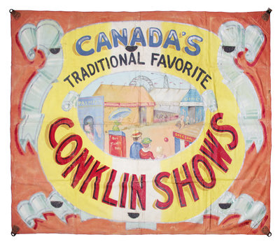 Canada's Traditional Favorite Conklin Shows, c. 1950. Circus banner depicting a traditional theme park surrounded by Conklin banner. Paint on canvas, signed lower right by Johnson. Light soiling; paint slightly cracked and chipped in some areas.