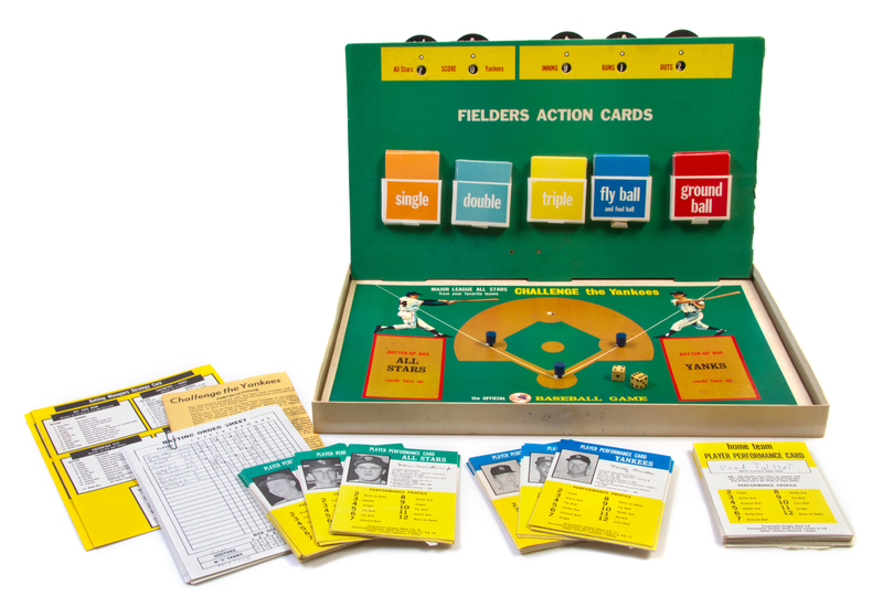 1964 "Challenge the Yankees" Board Game by Hasbro. Rare board game with complete original contents, including user instructions, 75 player performance cards, 120 action cards, two batting managers strategy cards, 20 batting order sheets, pair of dice and three player pegs; also with original Trowbridge Crafts, Inc. advertisement for "Rock Pox" laid in. Playing board intact and like-new. Playing cards perforated; "home team" playing cards used with names written in blue ballpoint pen; two batting order sheets completed in pencil; light wear to box; otherwise very good.
