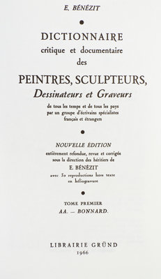 Dictionnaire critique et documentaire des peintres, sculpteurs, dessinateurs et graveurs de tous les temps et de tous les pays par un groupe decrivains specialistes francais et etrangers. S.l.: Librairie Grund, 1966.8 vols. 8vo, publisher's gilt-lettered maroon cloth. Limited edition, fourth printing, number 12107 of an unstated number. Light wear to boards; ends bumped.