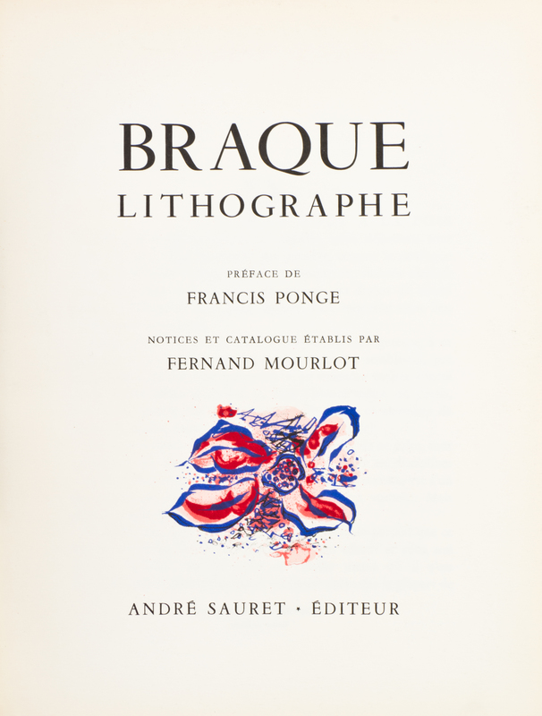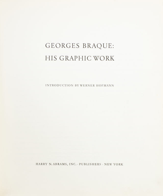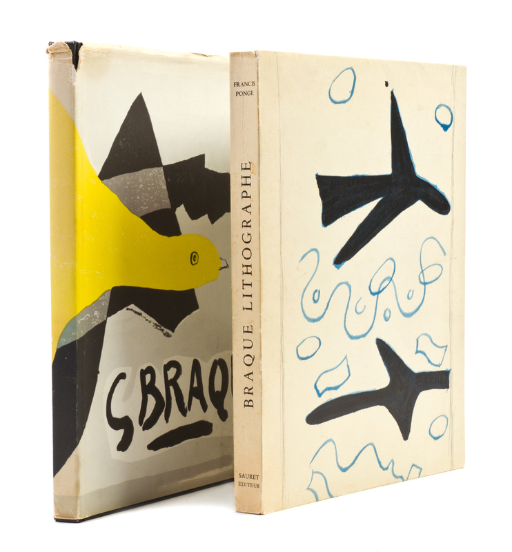 Braque Lithographe. Preface by Francis Ponge. (Monte Carlo:) Andre Sauret, (1963). 4to, original color lithographed stiff wraps. Limited edition, number 3,976 of 4,125 copies. With three original lithographs (frontispiece, title page, and wraps). Minor soiling and edgewear to wraps; light ghosting from frontispiece.[Together with:] Georges Braque: His Graphic Work. New York: Harry N. Abrams, (1961). 4to, publisher's black cloth lettered in white, dust jacket. Numerous reproduction plates including nine in color. Soiling to dust jacket and chipping to edges.