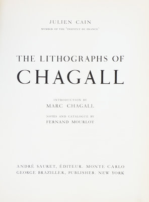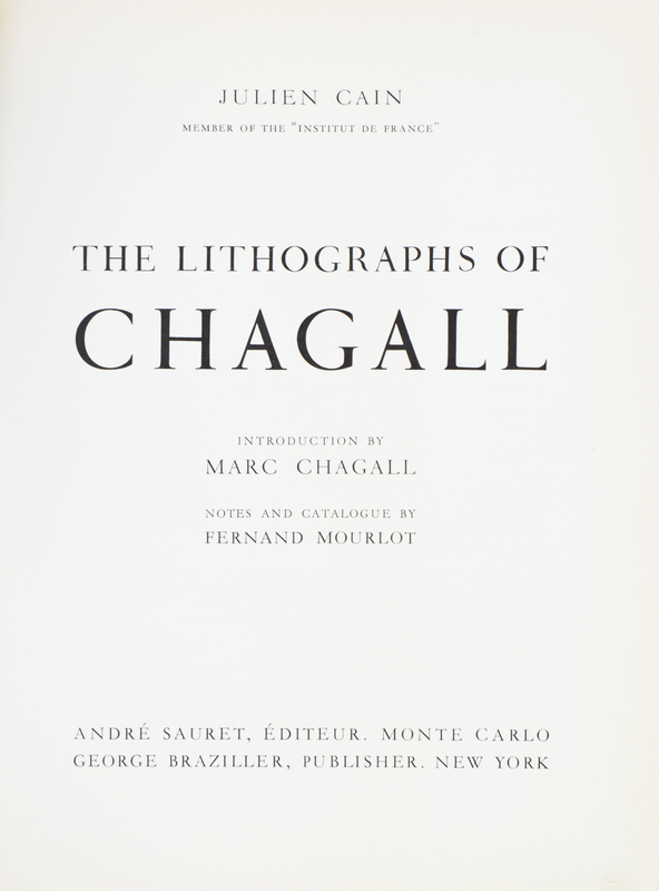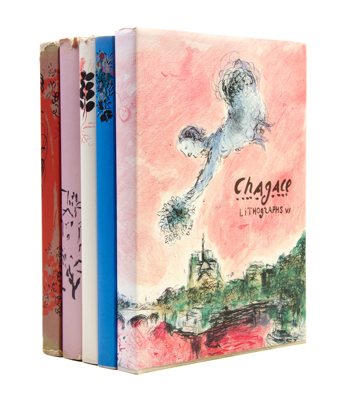 Chagall Lithographe I-IV and Lithographs VI. By Julien Cain, Fernand Mourlot, and Charles Sorlier. Monte Carlo: Andre Sauret; New York: Crown Publishers, 1960-1986.5 vols. 4to, publisher's boards, dust jackets, original glassine, text in French in two vols. With 28 original lithographs present as called for, including dust jackets. I: The Lithographs of Chagall. By Julien Cain, 1960. Text in French. With 12 original lithographs; II: The Lithographs of Chagall 1957-1962. By Fernand Mourlot, (1963). Text in English. With 12 original lithographs; III: Chagall Lithographe 1962-1968. By Julien Cain, (1969). Text in French. With two original lithographs; IV: The Lithographs of Chagall 1969-1973. By Charles Sorlier, (1974). Text in English. With two original lithographs; VI: Chagall Lithographs 1980-1985. By Charles Sorlier, (1986). Text in English.