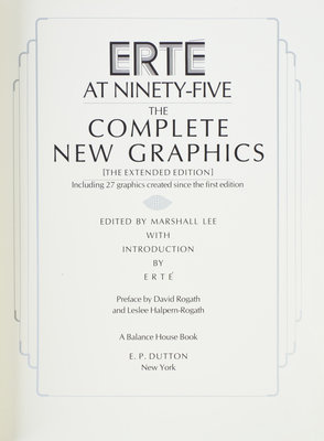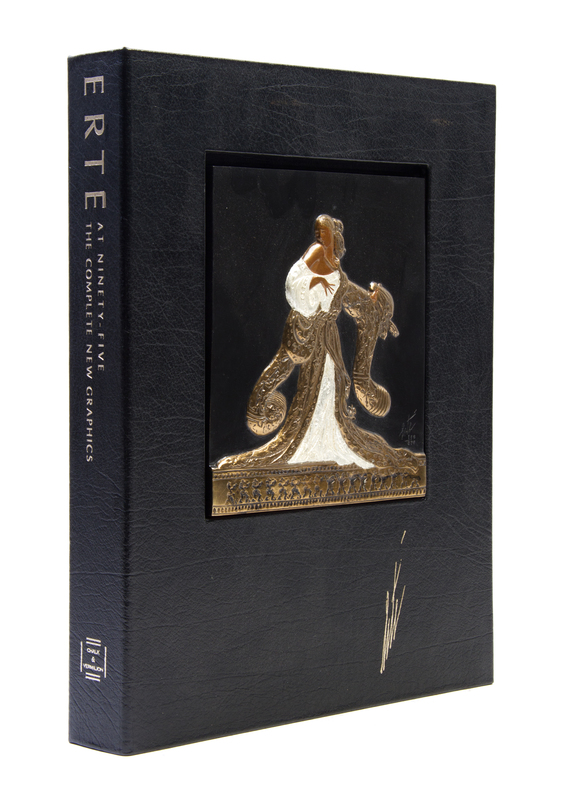 Erte at Ninety-Five. The Complete New Graphics, The Extended Edition. New York: E.P. Dutton, (1987).Folio, with polychrome bronze relief 'Rigoletto' mounted on cover with incised signature, stamped and numbered '186/375', with the stamp of the publisher, Chalk & Vermilion Fine Arts and Sevenarts Ltd, housed in original clam shell box. Additionally signed by Erte on the limitation page. Fine.