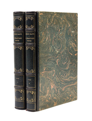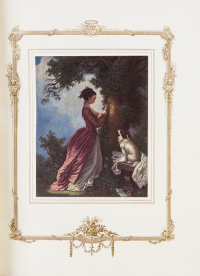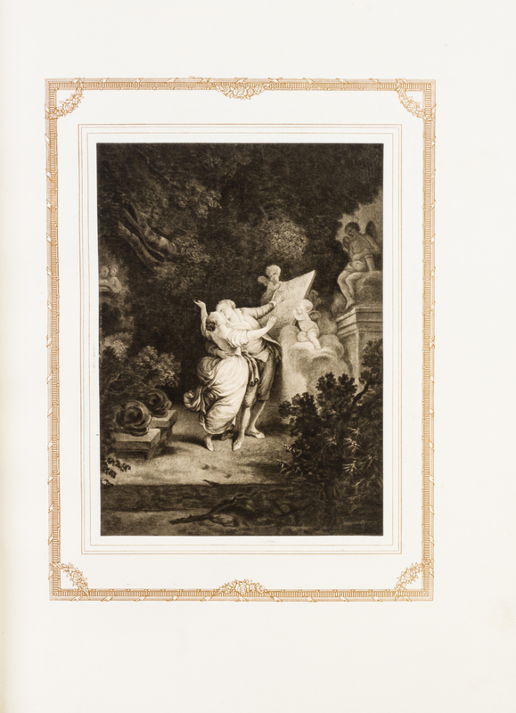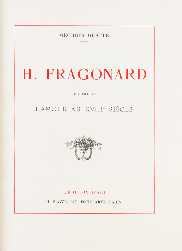 H. Fragonard. Peintre de l'amour au XVIIIe siecle. Edited by E. Piazza. Paris: L'Edition d'Art, (1913).2 vols. Folio, finely bound by Meunier in contemporary crushed navy blue morocco, gilt-decorated and -lettered spines, a.e.g., marbled slipcases, original wraps bound-in. Limited edition, number 27 of 500 copies on Japon, with original printed wraps bound-in. Illustrated with 89 (of 100) mounted illustrations with captioned tissue guards. Light rubbing to slipcases; otherwise fine.