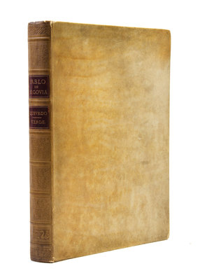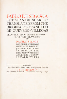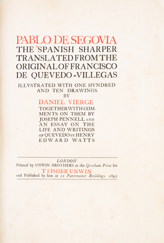 Pablo De Segovia. The Spanish Sharper. London: Printed by the Unwin Brothers, Gresham Press for T. Fisher Unwin, 1892.Folio, publisher's full vellum, gilt-tooled and -lettered spine. Illustrated with 110 drawings by Daniel Vierge. Soiling to boards; ends bumped; intermittent light foxing.