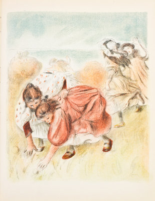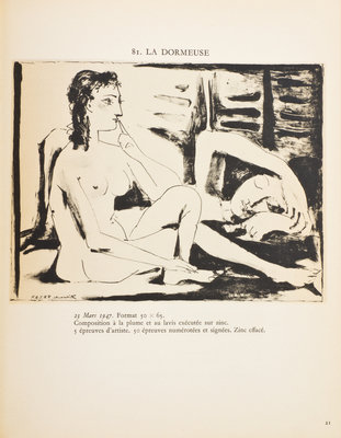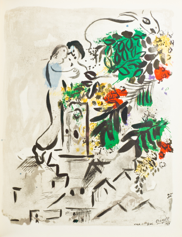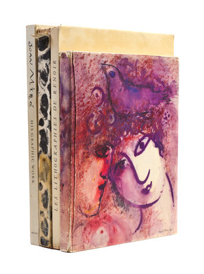 A group of four books.Marc Chagall. His Graphic Work. New York: Harry N. Abrams, (1957). 4to, publisher's pictorial cloth, dust jacket. Marginal chipping and small tears to jacket, repaired. Picasso lithographe II, 1947-1949. Monte-Carlo: Andre Sauret, (1950). 4to, publisher's stiff wraps. Numerous black and white and color illustrations throughout. Wear and light soiling to wraps; backstrip detached from text-block. Les lithographies de Renoir. By Claude Roger-Marx. Monte-Carlo: Andre Sauret, (1951). 4to, publisher's printed stiff wraps. Limited edition, number 2,376 of 3,000 copies on Grand Velin Renage Filigrane. Marginal chipping to wrappers; toning to edges of leaves; hinges starting. Joan Miro. His Graphic Work. New York: Harry N. Abrams, (1958). 4to, publisher's pictorial cloth. Rubbing and soiling to boards.