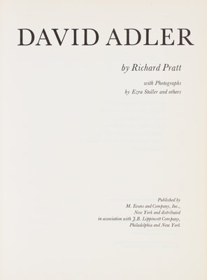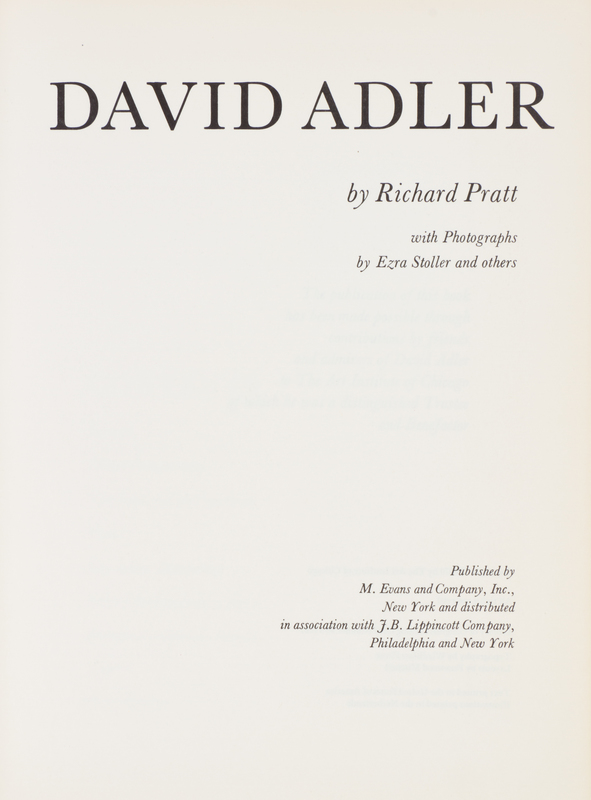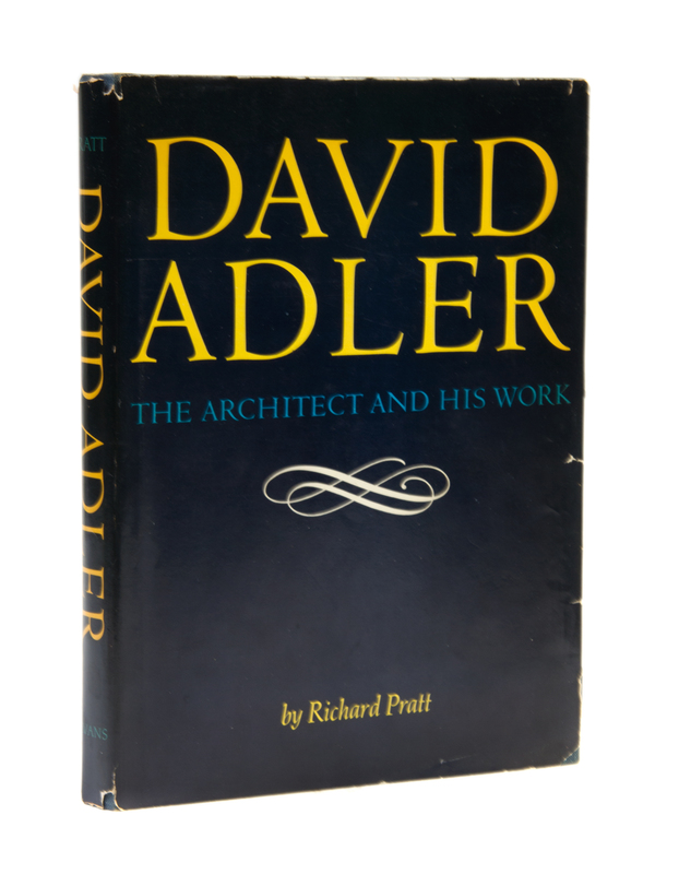 David Adler. The Architect and His Work. New York: M. Evans, (1970).4to, publisher's blue gilt-lettered cloth, dust jacket, clipped. First and only edition. Minor marginal chipping to jacket; toning to edges of leaves.