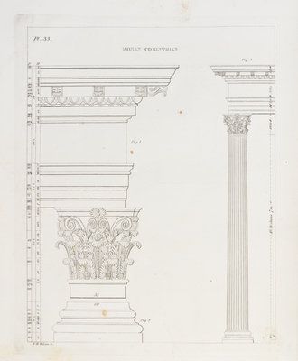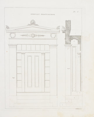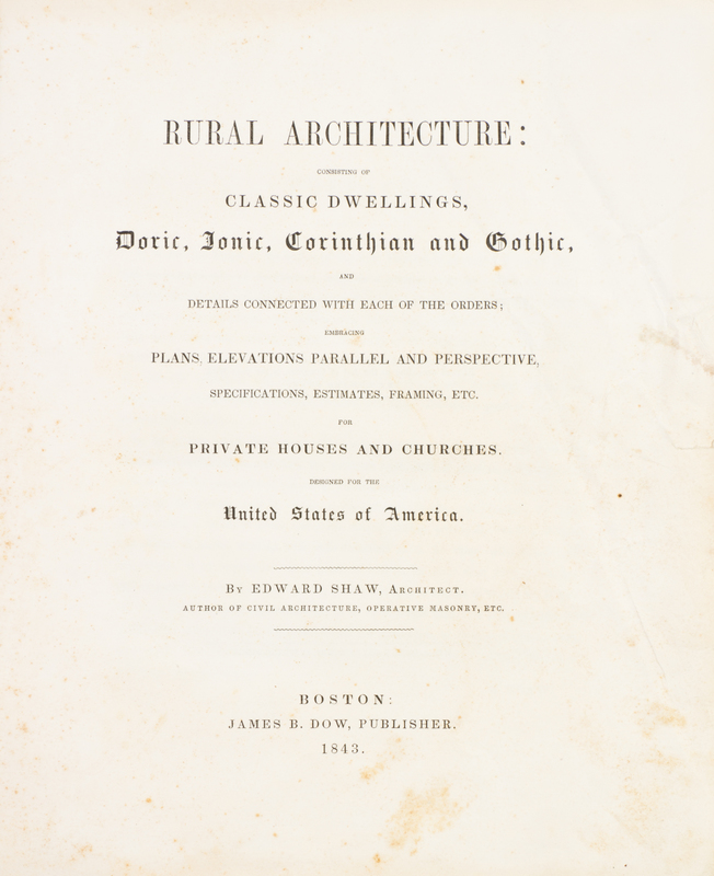 Rural Architecture: Consisting of Classic Dwellings, Doric, Ionic, Corinthian and Gothic... Boston: James B. Dow, 1843.4to, full calf, gilt-lettered green morocco spine label. First and only edition. Complete with 52 plates. Wear to boards; spine chipped with some loss to ends; intermittent foxing and brownspotting.