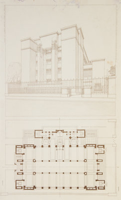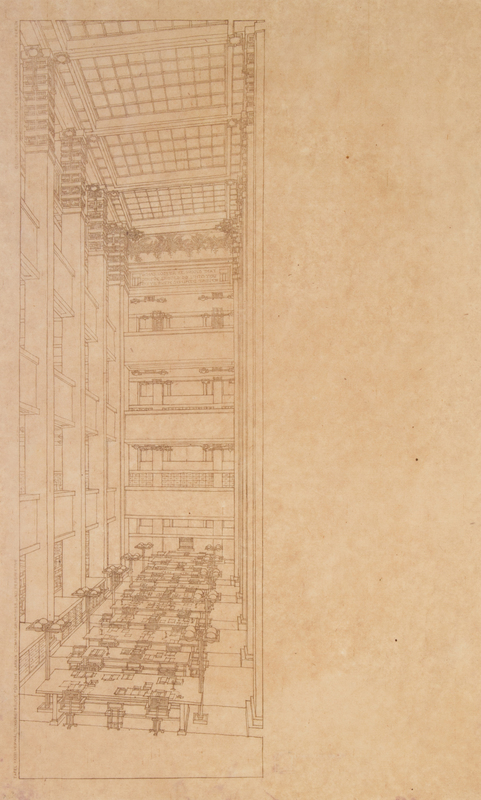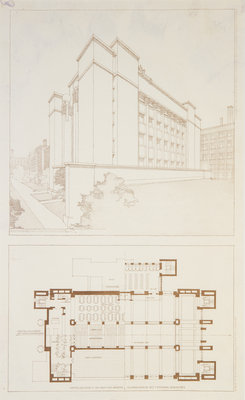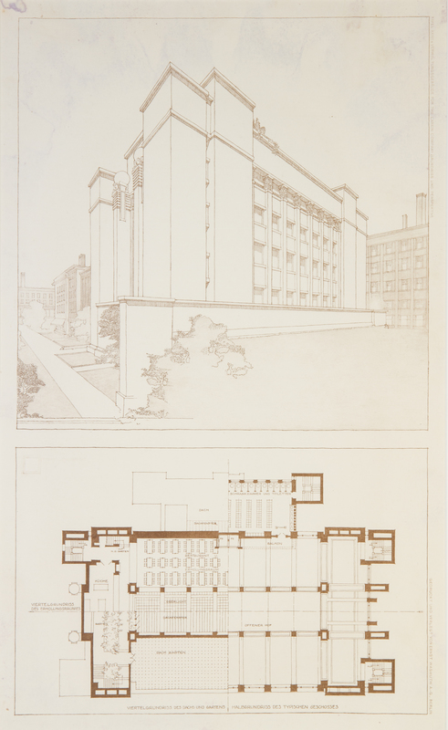 Three blueprint lithographs from the Wasmuth Portfolio entitled, Tafel XXXIII verwal tungsgebaude for the Larkin Company grundriss und perspektive, each with blind-stamped foundry mark. Ernst Wasmuth: AG Berlin, 1910. Framed and matted.