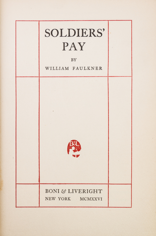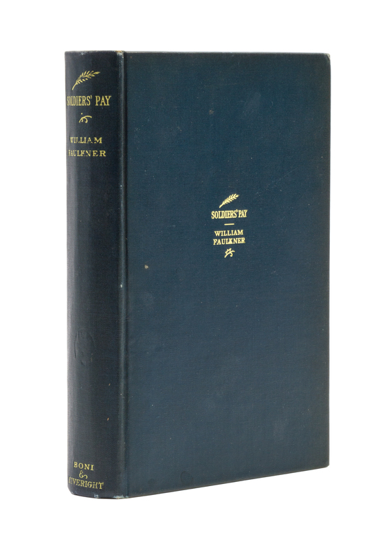 Soldiers' Pay. New York: Boni & Liveright, 1926.8vo, publisher's blue cloth lettered in yellow, blue and white patterned endpapers, top edge stained yellow, faded. Housed in blue cloth slipcase. First edition. Lacking dust jacket; minor edgewear; wear to slipcase; hinges tender.