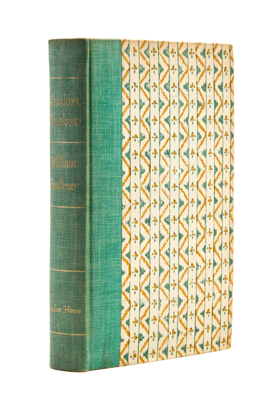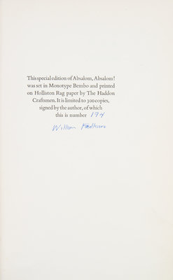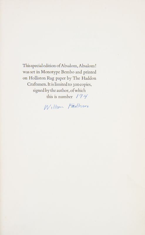 Absalom, Absalom! New York: Random House, 1936.8vo, quarter green cloth over decorative boards, gilt-lettered spine. Number 194 of 300 copies on Holliston Rag paper by the Haddon Craftsmen. First edition, signed by Faulkner on the limitation page. Minor soiling to boards; previous owner's pen ex-libris to f.f.e.p.