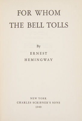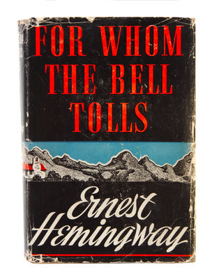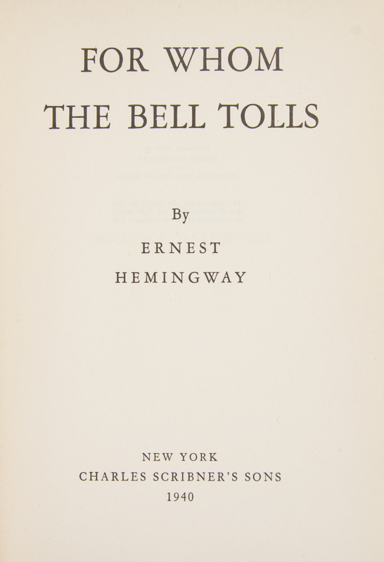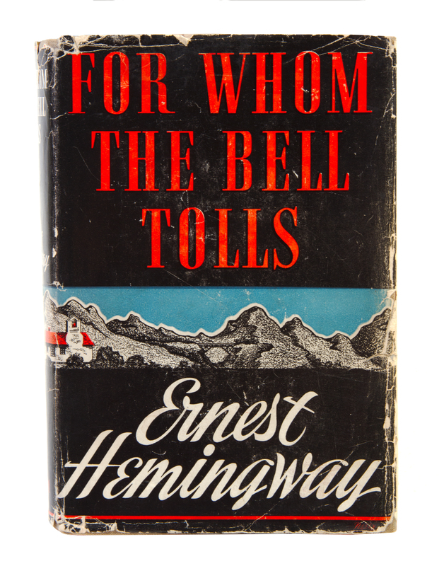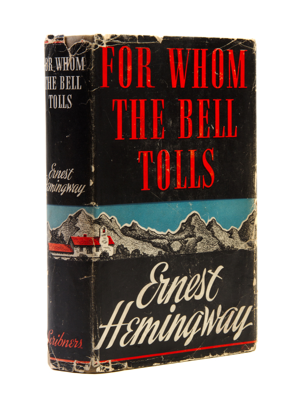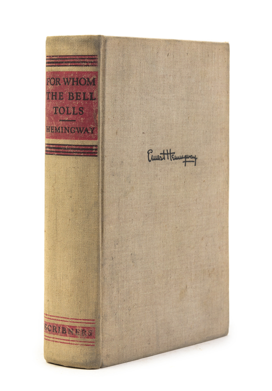 For Whom the Bell Tolls. New York: Charles Scribner's Sons, 1940.8vo, publisher's oatmeal cloth, title in black to red spine label, author's black facsimile signature to upper board, original dust jacket. First edition, first printing, with "A" to copyright page, in first issue dust jacket without photographer's name below portrait of Hemingway on rear panel. Soiling to boards; marginal chipping to jacket with some loss to head of spine and 1-inch portion lacking from lower left corner of rear panel.