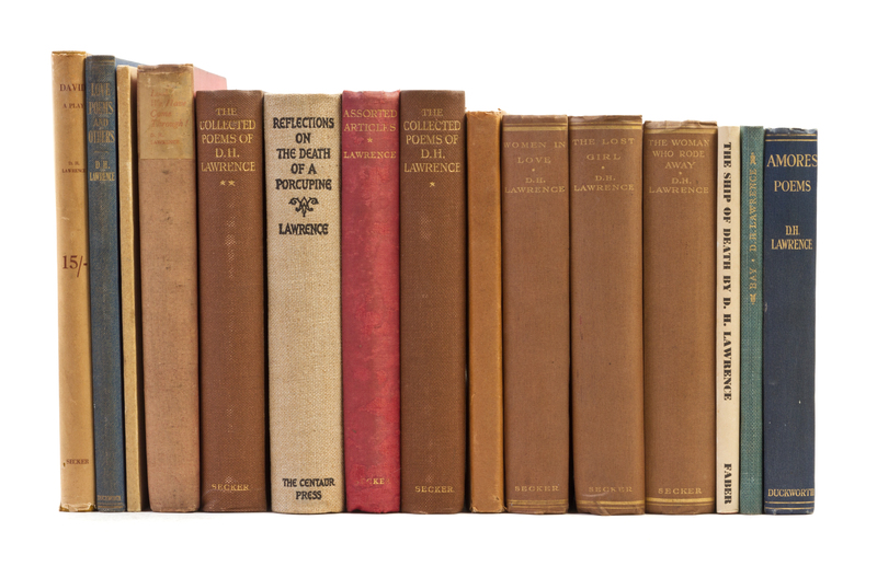 A group of 15 books and works of poetry.Love and Other Poems. London, 1913. Bay, a Book of Poems. London, 1919. The Collected Poems of D.H. Lawrence. London, 1928. 2 vols. Amores. Poems. London, n.d. The Ship of Death and Other Poems. London, (1941). Women in Love. London, (1921). Assorted Articles. London, 1930. Reflections on the Death of a Porcupine and Other Essays. Philadelphia, 1925. The Lost Girl. London, (1920). David. A Play. London, (1926). Lasca's Story of Dottor Manente. Florence, 1929. Look! We Have Come Through! London, 1917. My Skirmishes with Jolly Roger. New York, 1929.