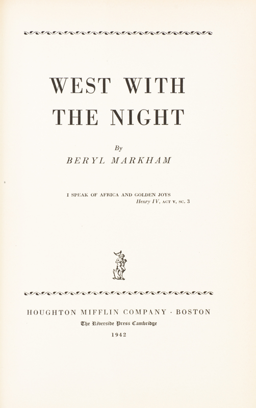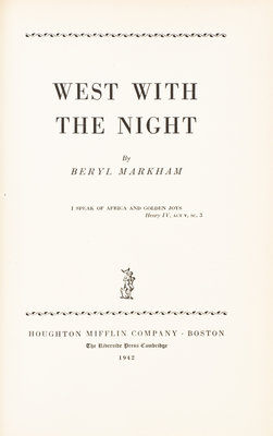 West with the Night. Boston and Cambridge: Houghton Mifflin and Riverside Press, 1942.8vo, publisher's aquamarine cloth lettered in black, dust jacket. First edition. Minor soiling to boards; marginal chipping and edgewear to jacket.