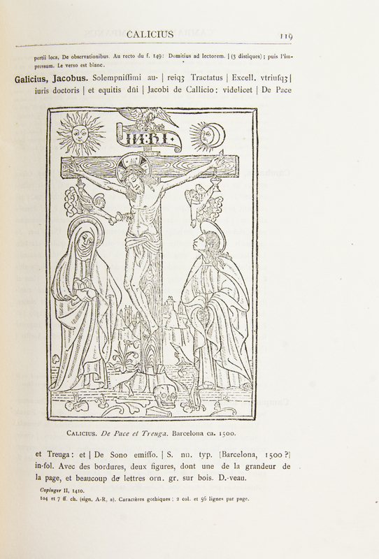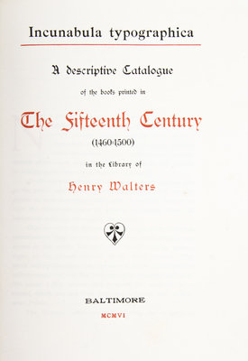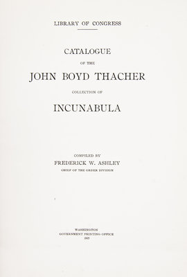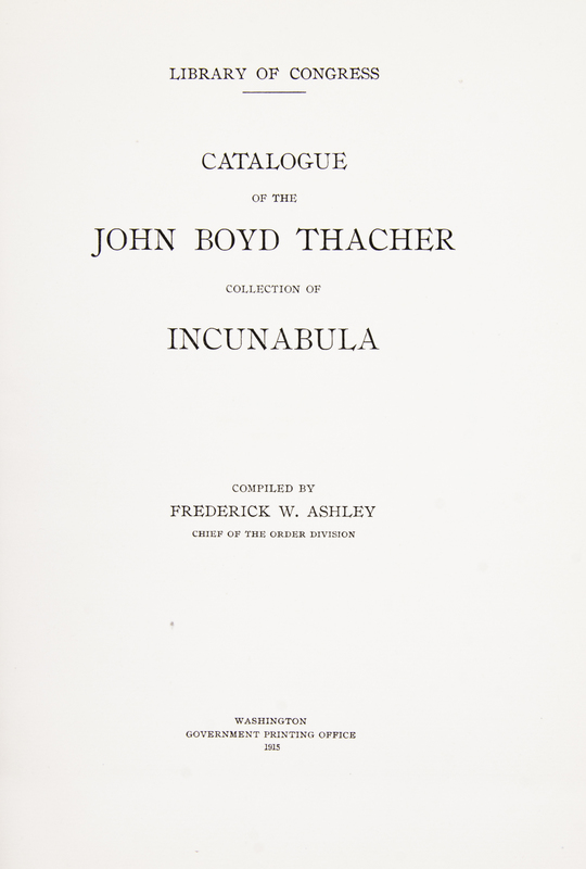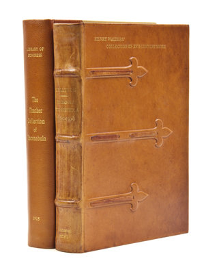 Two works on important collections of incunabula. Incunabula typographica. A Description Catalogue of the books printed in the Fifteenth Century (1460-1500) in the Library of Henry Walters. Baltimore: [The Walters Art Gallery], 1906. 4to, period-style full calf binding with raised fleur-de-lis shaped bands, gilt-lettered spine and upper board, t.e.g., others uncut. Bookseller's sticker to rear pastedown; otherwise fine. Library of Congress: Catalogue of the John Boyd Thacher Collection of Incunabula. Compiled by Frederick W. Ashley. Washington: Government Printing Office, 1915. 4to, quarter tan morocco over linen boards, gilt-lettered spine, t.e.g., others uncut.