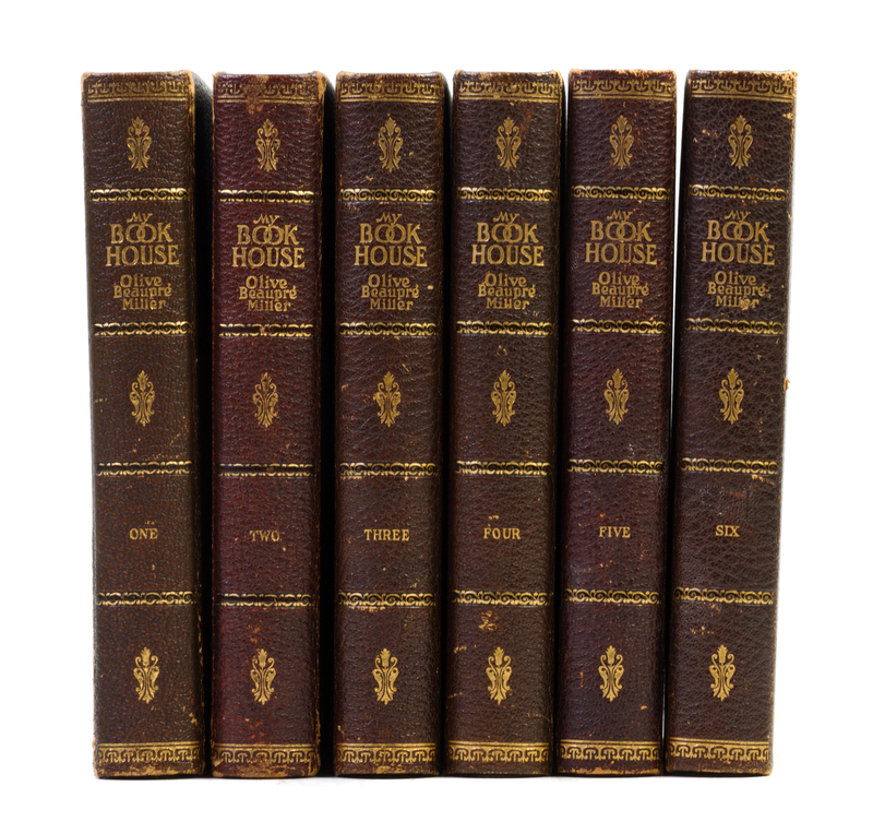 My Book House. Chicago: The Bookhouse for Children, (1925).6 vols. 8vo, full green crushed morocco, gilt-lettered spines, a.e.g. Second edition, signed by Beaupre on the f.f.e.p. of vol. one. Color illustrations throughout. Rubbing to boards at spines; toning to leaves at edges.