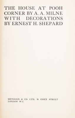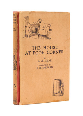 The House at Pooh Corner. London: Methuen, (1928).8vo, publisher's pictorially gilt-stamped pink cloth, dust jacket. First edition. With frontispiece and illustrations throughout by E.H. Shepard. Dust jacket lightly soiled, front panel detached; offsetting from ephemera to endpapers; bookplate tipped to front pastedown.
