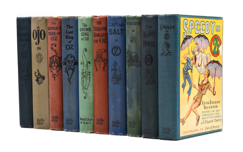 A group of 10 books from the Oz series by Ruth Plumbly Thompson. Chicago: Reilly & Lee, 1925-1935. 8vo, publisher's quarter cloth, pictorial pastedown title label to all vols. Speedy in Oz, (1934). The Gnome King of Oz, (1927). OJO in Oz, (1933). The Wishing Horse of Oz, (1935). The Yellow Knight of Oz, (1930). Captain Salt in Oz, (1936). Jack Pumpkinhead of Oz, (1929). Pirates in Oz, (1931). The Hungry Tiger of Oz, (1926). The Lost King of Oz, (1925).