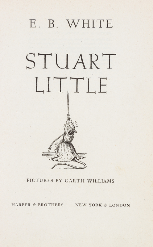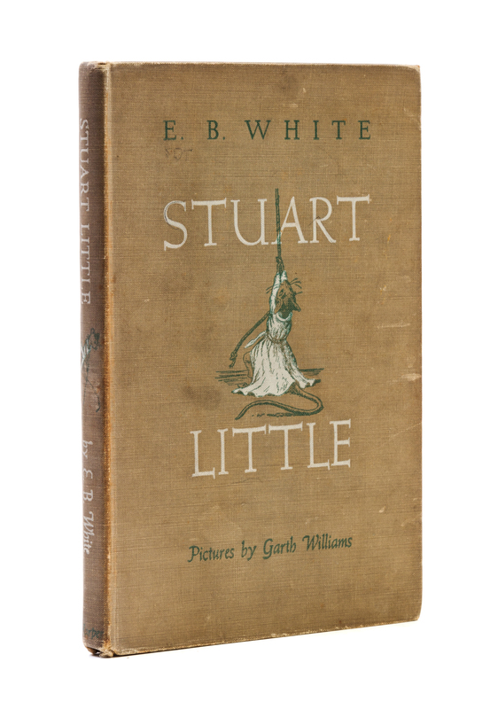 Stuart Little. New York and London: Harper & Brothers, (1945).8vo, publisher's tan cloth pictorially stamped and lettered in white and green, lacking dust jacket. First edition, with "10-5/First Edition/I-U" on the copyright page. Illustrated by Garth Williams. Edgewear and soiling to boards; contemporary manuscript notations in pencil to f.f.e.p.