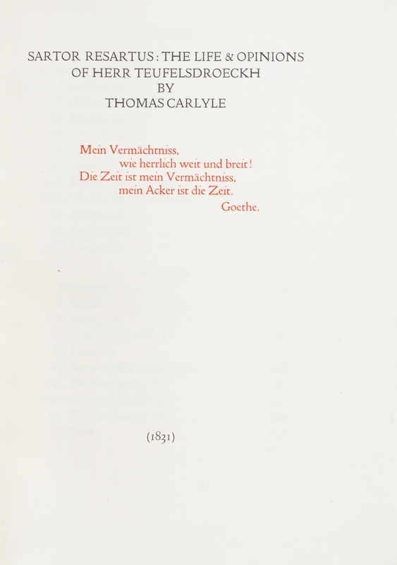 Sartor Resartus: The Life & Opinions of herr Teufelsdroeckh. Hammersmith: Doves Press, 1907.8vo, full vellum, gilt-lettered spine, slipcase. Limited to 300 copies. Minor soiling to boards.